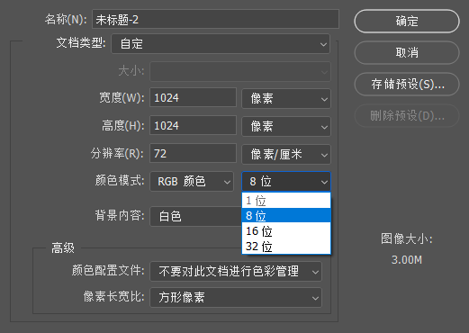 在Photoshop中,常用的都是8位的色彩,在新建图像的时候就可以确定。8位指的是单一色彩的值,"位"这个词相比很容易就想到2进制,确实如此,8位就表示了2的8次幂,也就是从0~255共256个数字。