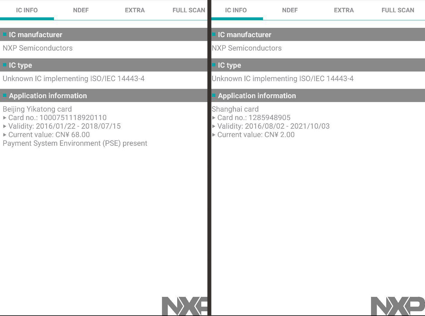 例如下图是我的北京公交卡和上海公交卡,以及它们的信息, 可以看到, 卡的技术标准就源于NXP公司: